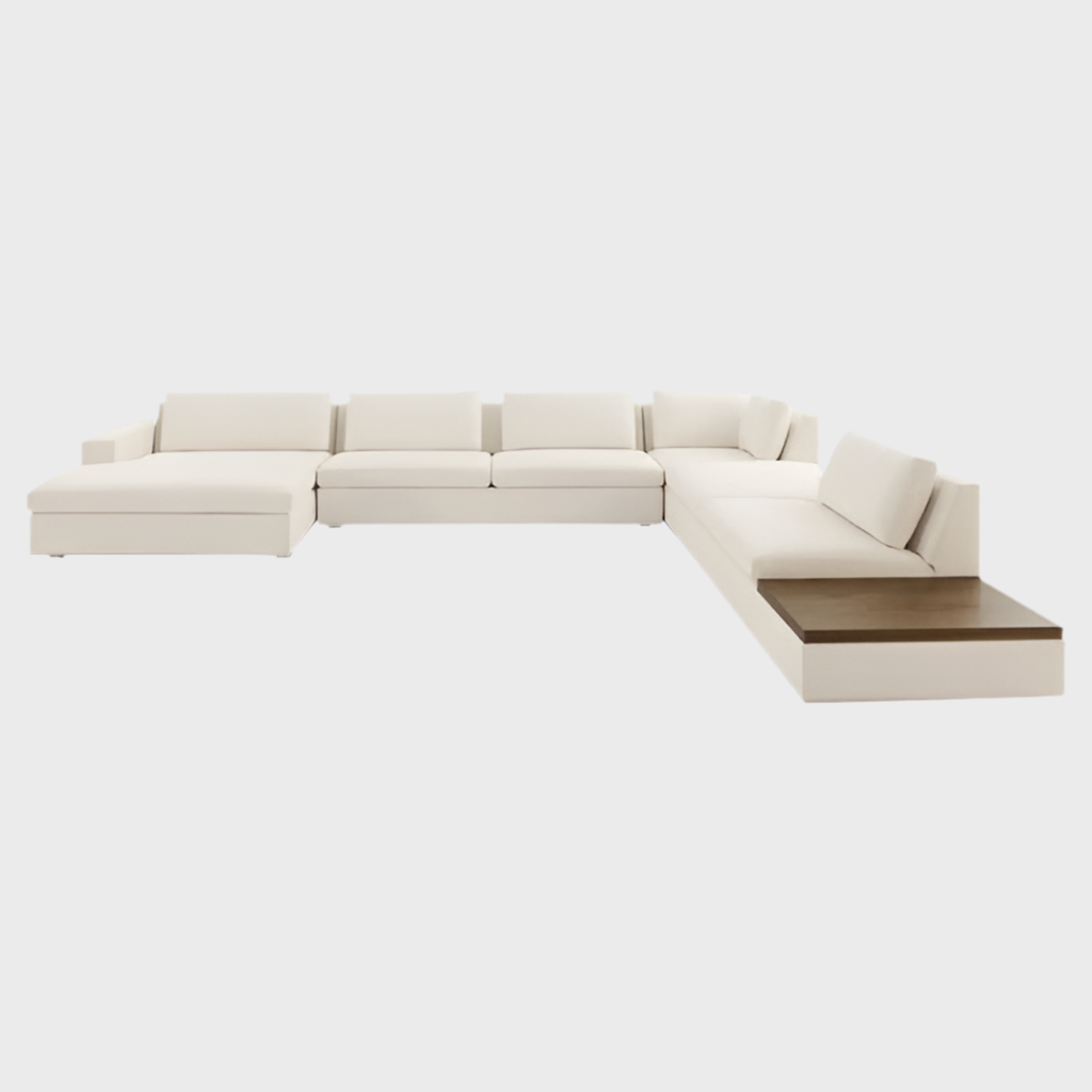 With its large L-shape design, the Fam Cocoon Sofa comfortably seats up to 6, making it perfect for family gatherings and movie nights. while the included side table adds convenience and style. The chunky silhouette, deep foam cushions, and soft, textured fabric offer plush comfort and modern style for any room.