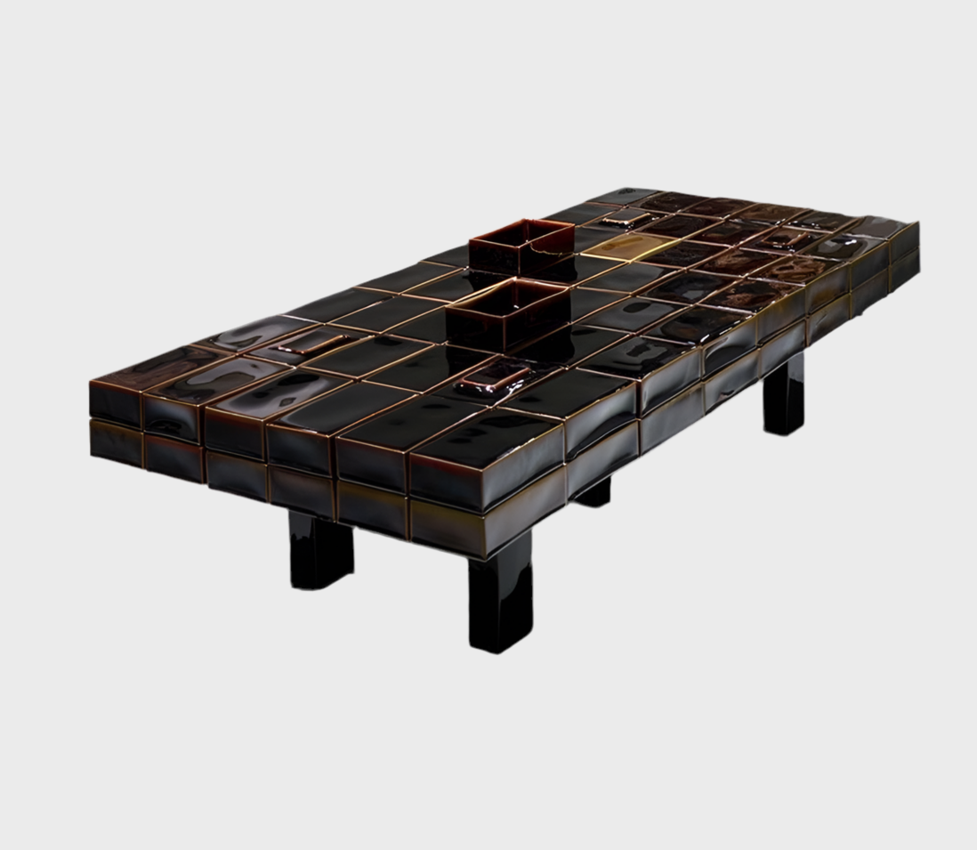 A rectangular coffee table featuring a surface clad in small glossy ceramic tiles, arranged in a vibrant mosaic pattern. The tabletop rests on sleek metal legs, offering a modern contrast to the handcrafted tile texture. Durable, eye-catching, and easy to clean, it’s ideal for adding artistic flair to living rooms, patios, or stylish cafés.