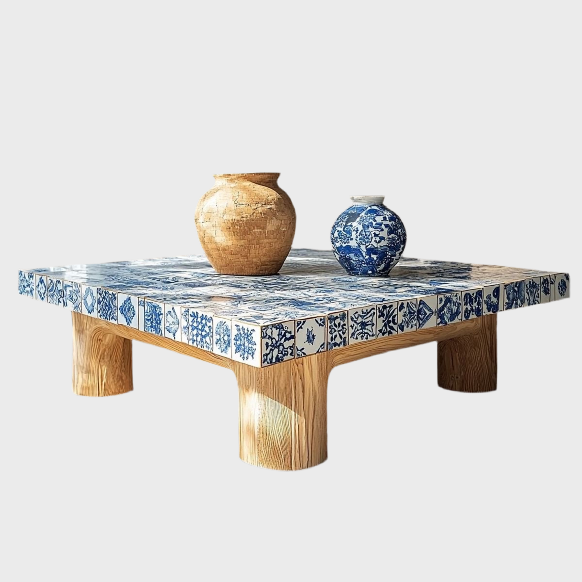 This handcrafted centerpiece features bold, solid pitchpine trunk legs and a vibrant mosaic-tiled top in shades of ocean blue and crisp white. Every square tile reflects sunlight like waves, making it the perfect outdoor coffee table for beach homes, terraces, or summer lounges.