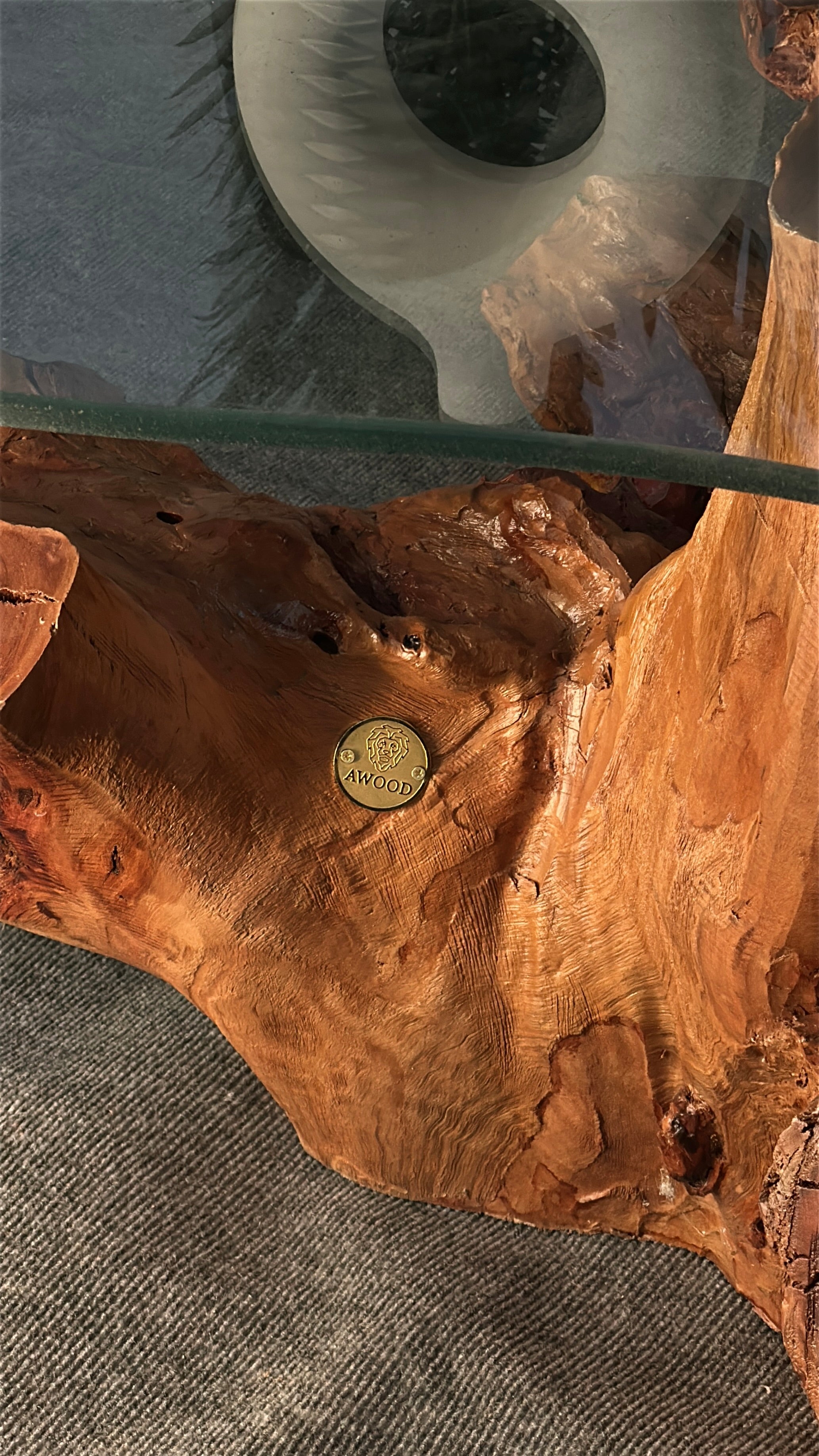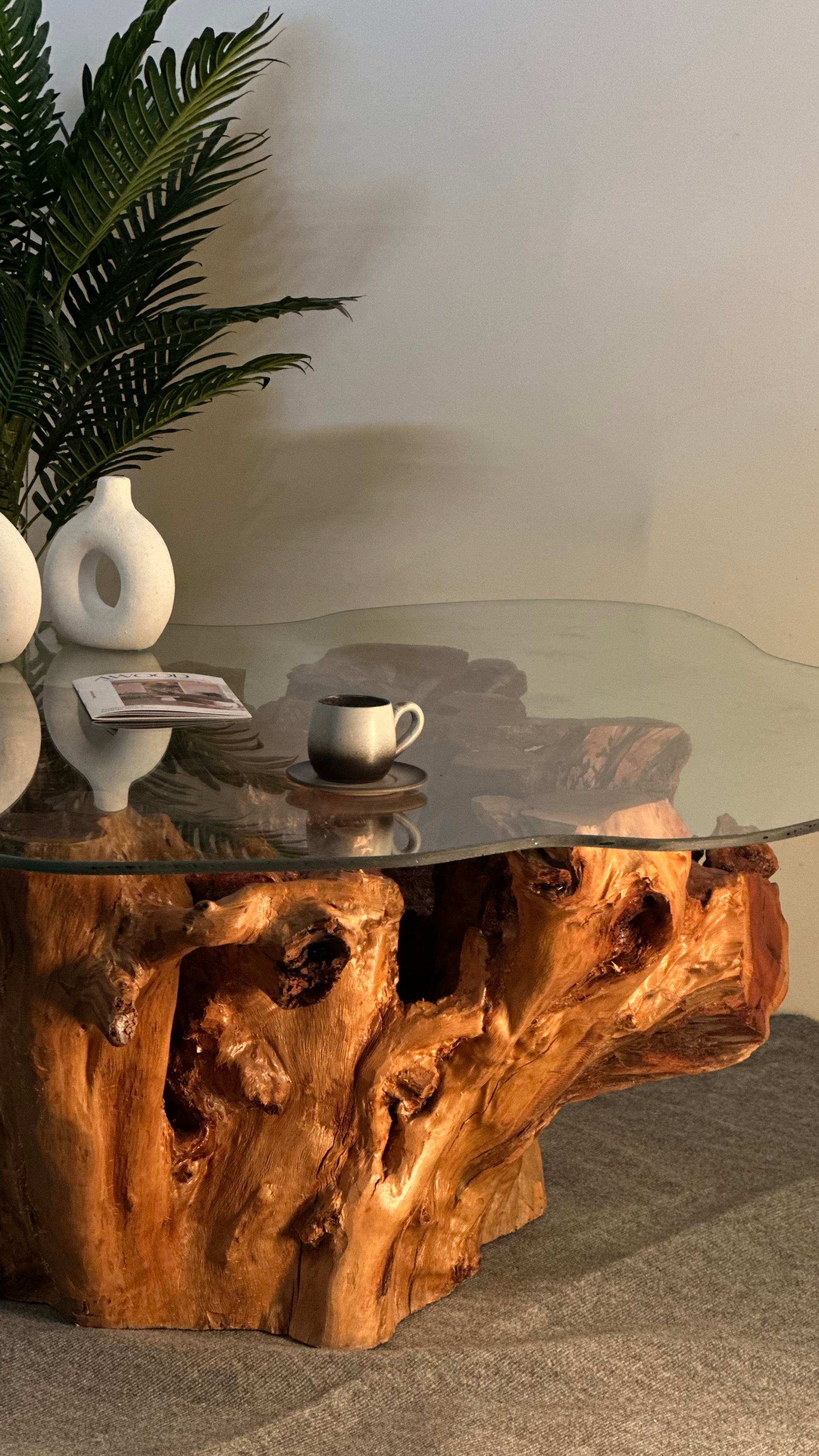 Earthglass pairs a sculptural Natural Tree Trunk base with a clear glass irregular top, highlighting natural form and texture. Grounded, minimal, and quietly bold, it brings balance and calm to any space.