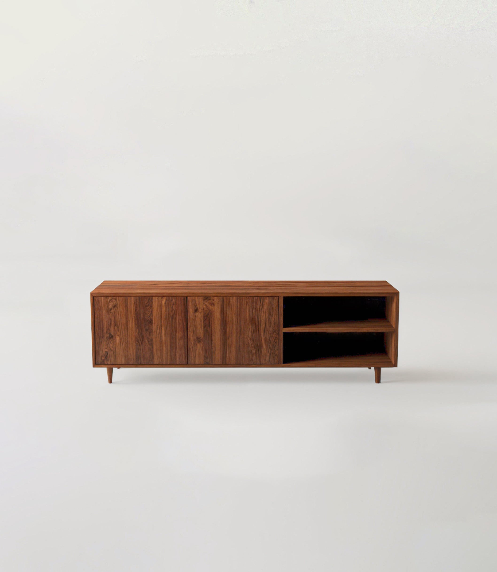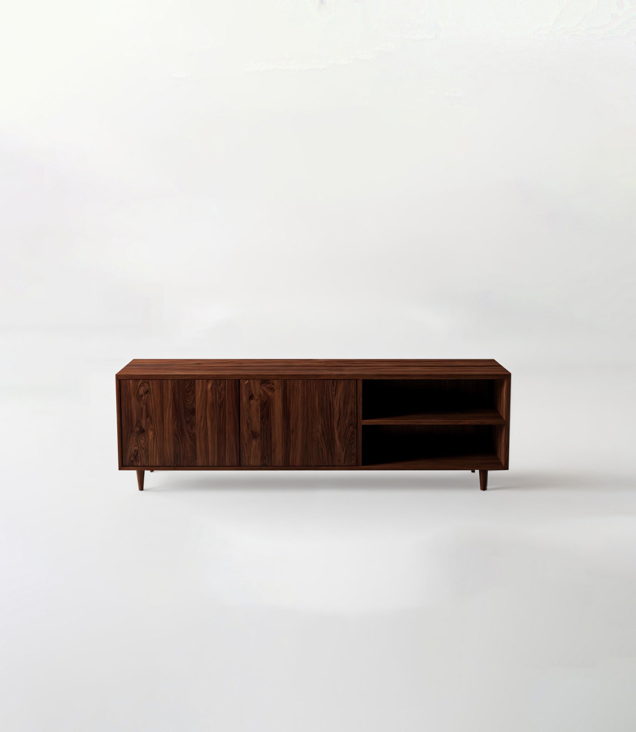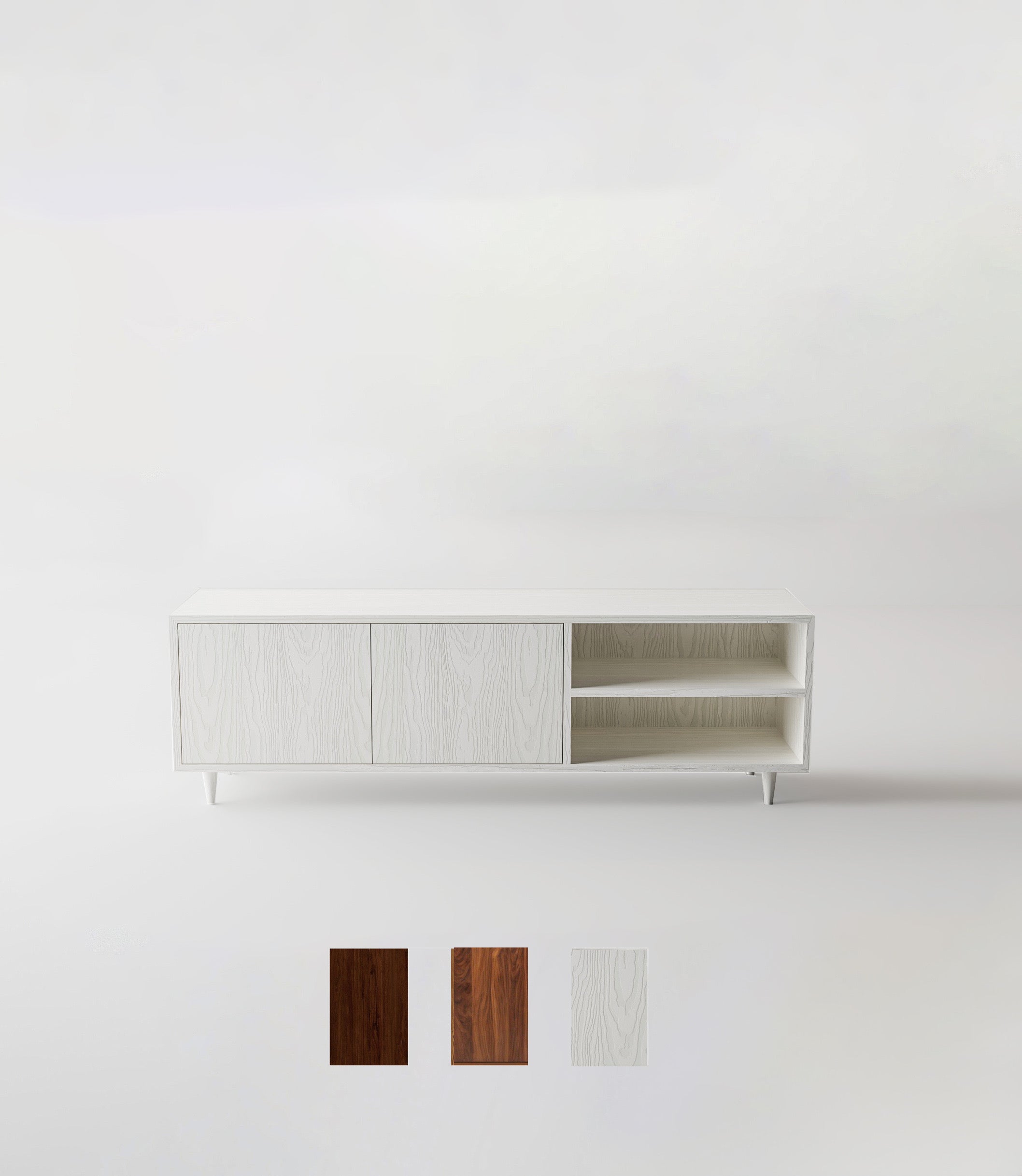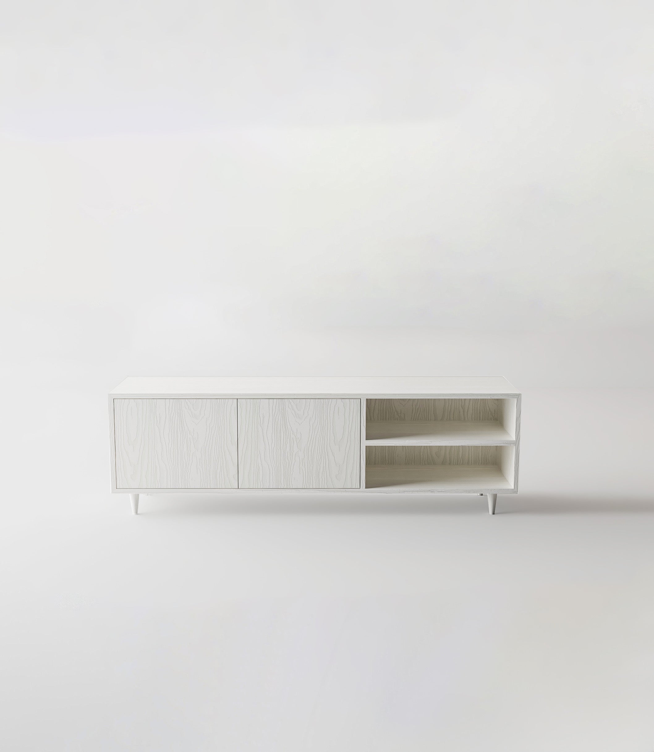 this Sleek TV unit combines minimalist design with practical storage. It features a smooth crown-cut wooden artificial veneer finish, giving it a warm, natural look with consistent grain patterns. Standing on sturdy beech wood cone legs, the unit is both durable and stylish.